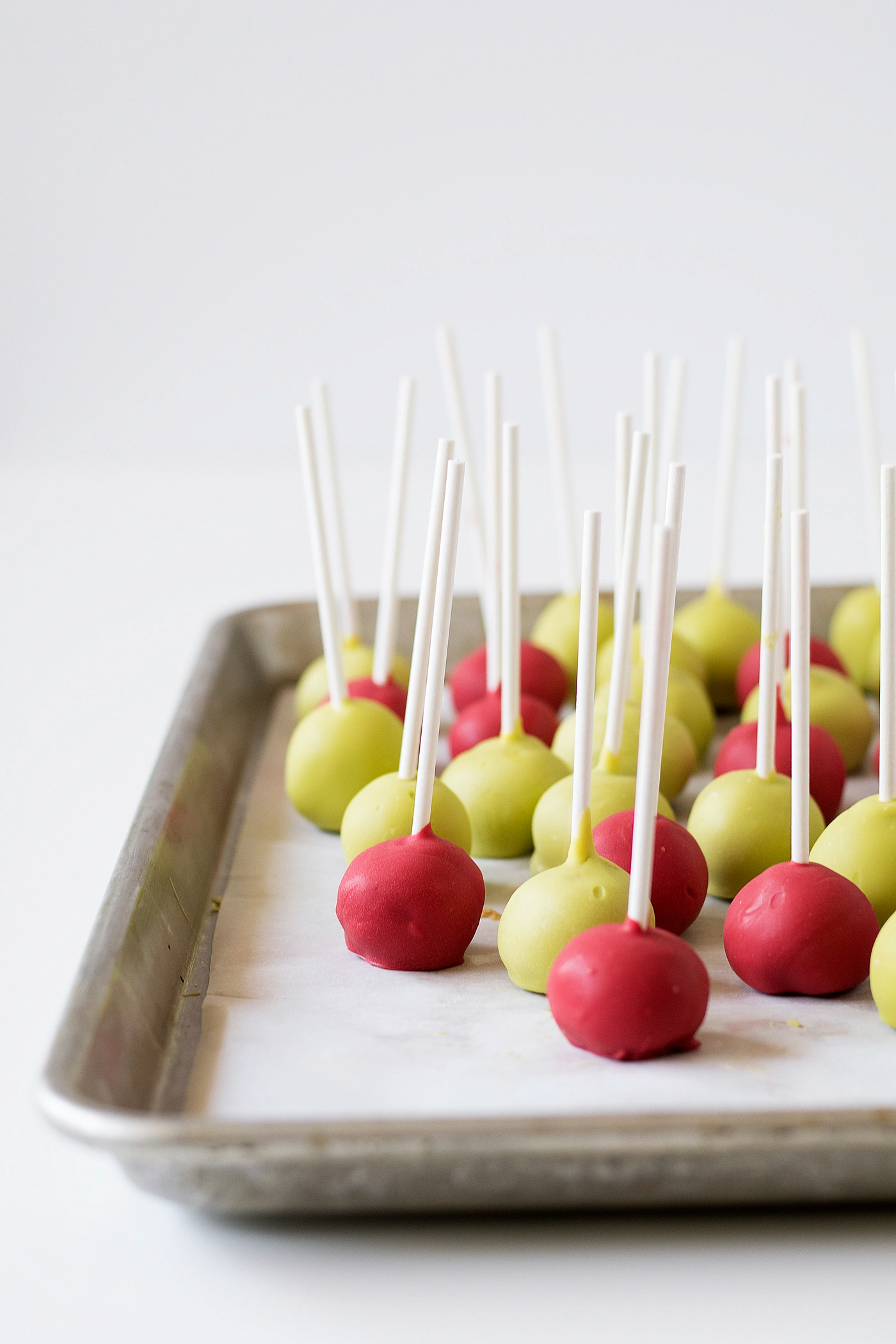 Melt red and green candy melts in microwave-safe bowls per instructions on package. Dip the tip of your lollipop stick into the melted candy coating, and insert into an Oreo ball, pushing it no more than halfway through. Holding the lollipop stick, dip the entire Oreo ball in the melted candy coating until it is completely covered. Place back on prepared sheet to harden. Repeat until all the Oreo balls are covered in red or green candy coating. Set aside to harden.
