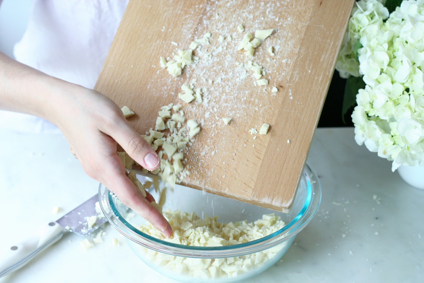 Chop the white chocolate finely and place in a bowl. Heat the heavy cream until boiling and pour over the chocolate. Don't stir! Cover with plastic wrap, or put a lid on the bowl, and let sit for 2 minutes.